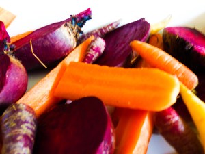 - Preheat your oven and then take your beetroot and carrots, slice in half and place on a baking tray with the garlic. Spray with fry light, lightly season and pop in the oven until they are soft, should take around 40 minutes.