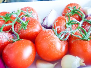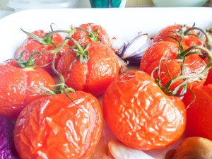 - Preheat your oven and then take your 500g of tomatoes, mine were on a vine so I kept them on the vine, whole and placed on the baking tray. Quarter your onions and also place on the tray with you garlic.