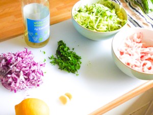 - Firsts things first you want to rinse your prawns and set aside, finely chop your red onion, grate your courgette and finely chop the parsley.