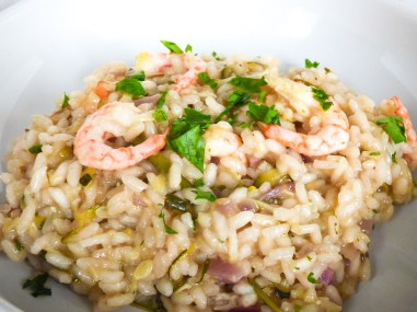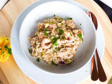 - Finish the dish with the other half of the lemon’s juice, stir in a handful of chopped parley and if you wish grate some Parmesan in to the risotto to give it further creaminess.